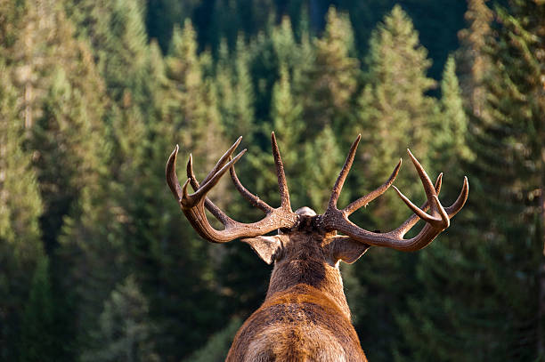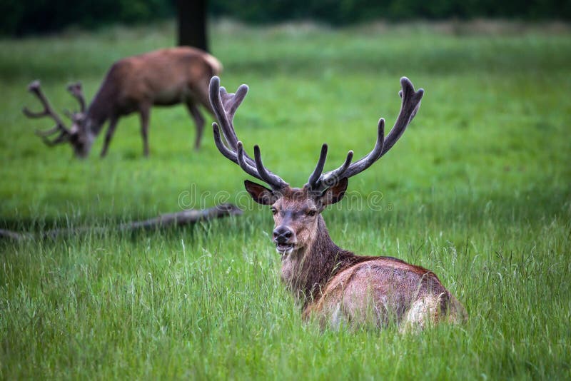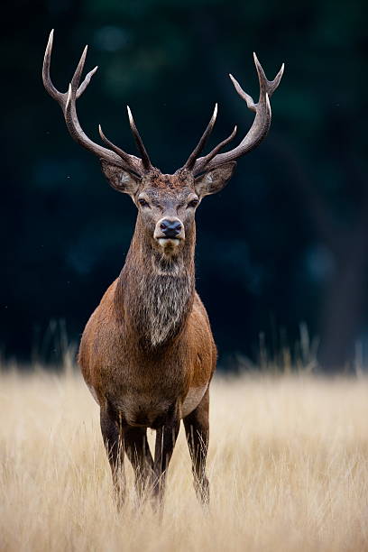 Red deer stag (Cervus elaphus). This is either a hart (a male in its fifth year) or a full-grown red deer stag in its sixth year. It does not yet have the full rack of antlers necessary to defend a group of females.