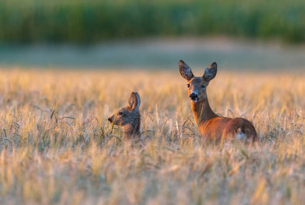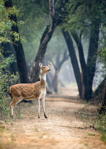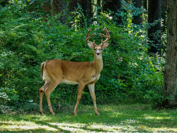 Deer canada, on an asphalt of a boreal forest of North America route. Risk of accident by car colision between the wild animal. The car collisions with Deer Crossing Road, causing injuries and fatalities among both deer and humans.